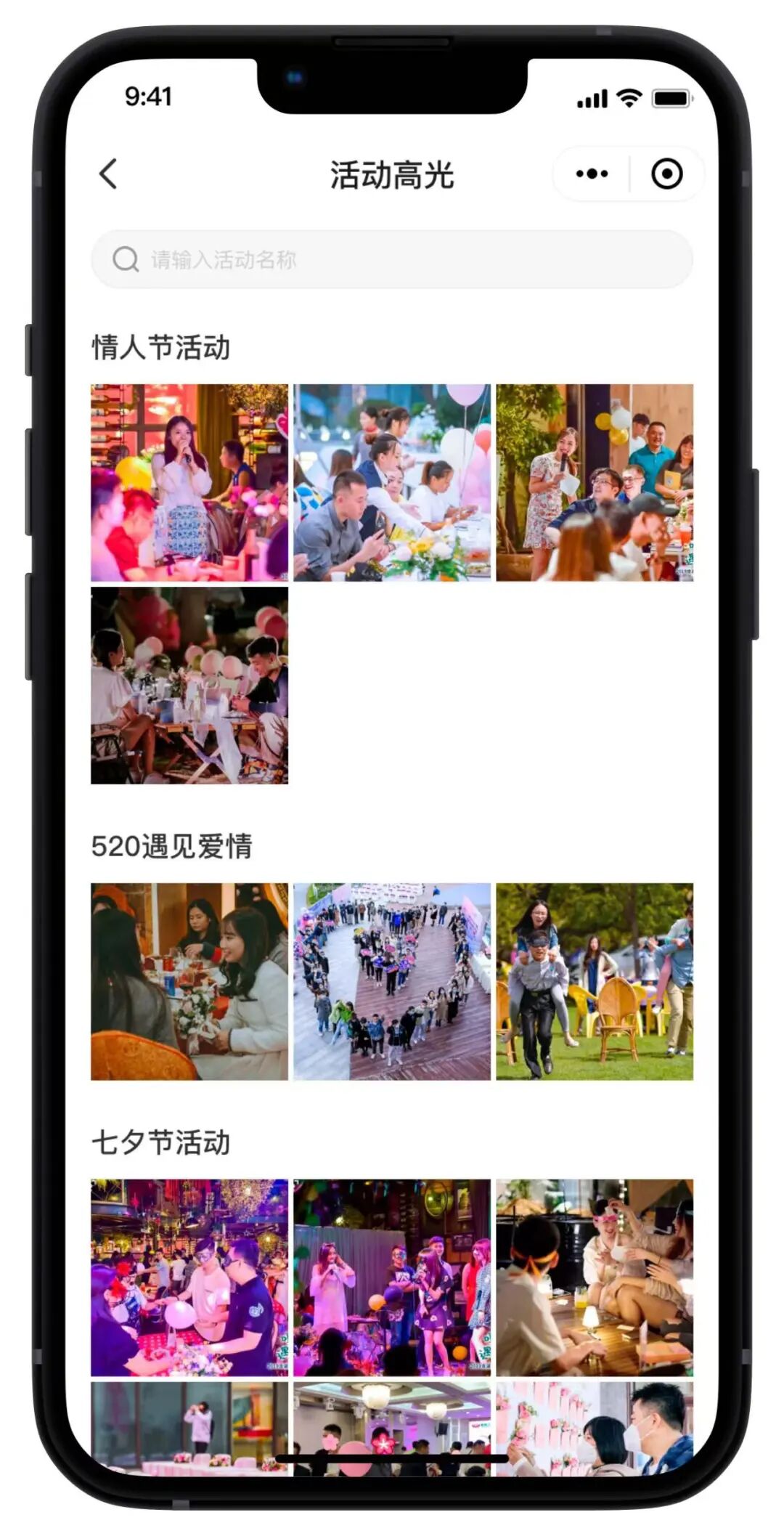 用户从首页进入,可以在“活动高光”页面浏览鹊桥活动的照片。